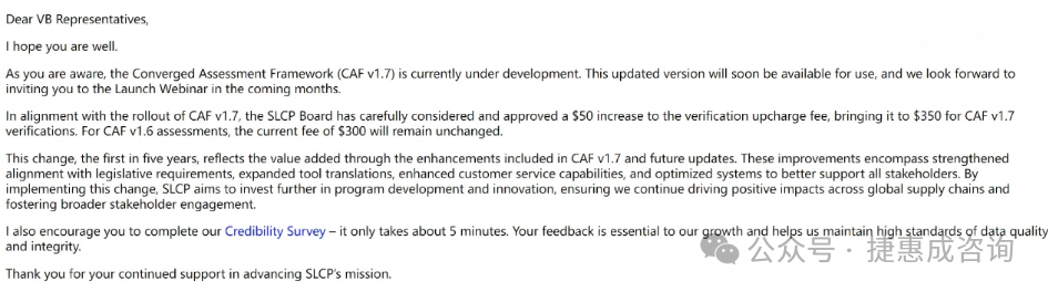 SLCP认证平台管理费将涨价50美金发表时间:2025-04-01 17:26 SLCP (Social & Labor Convergence Program)即社会劳工整合项目,是一个多方利益相关者的合作项目。即将在2025年4月迎来了平台的再一次提升,聚合评估框架(CAF v1.7)。同时平台管理费从之前的300美金/验证(CAF V1.6)涨价到350美金/验证(CAF v1.7)。