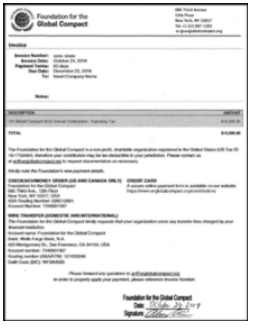 年度的企业参与费用账单将通过全球契约基金会指定邮箱以英文邮件的形式发送给企业财务联系邮箱。每年企业参与费用账单的发送日期与企业在首年正式如入联合全球契约组织的日期基本一致。缴纳方式以企业参与费用账单上的信息为准